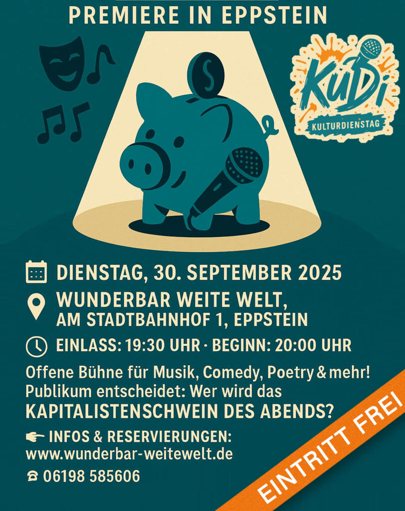 Premiere von Kunst gegen Bares in Eppstein! Offene Bühne für Musik, Comedy, Poetry & mehr – das Publikum entscheidet, wer zum Kapitalistenschwein des Abends gekürt wird. Einlass 19:30 Uhr, Beginn 20:00 Uhr in der Wunderbar Weiten Welt.