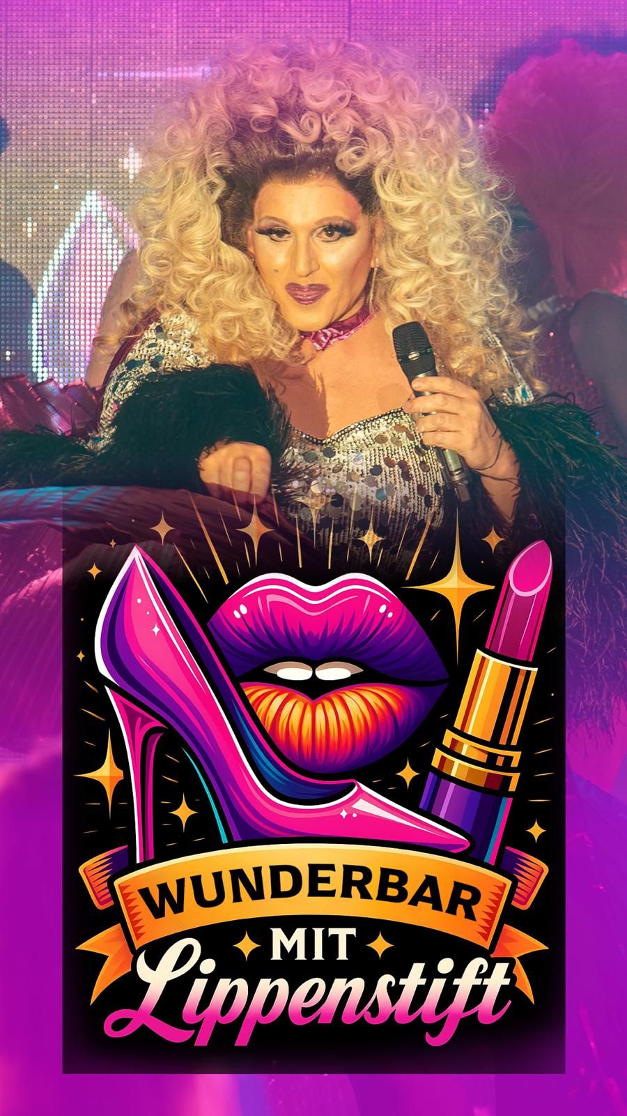 Freut euch auf einen spritzig-lustigen Drag- und Travestieabend voller Glanz, Humor und Gefühl.