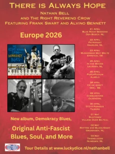 Nathan Bell ist bekannt als herausragender Singer-Songwriter aus Signal Mountain, Tennessee, der mit seinen Songs, die zwischen Americana und Blues angesiedelt sind, innerhalb weniger Minuten zu begeistern weiß. Auf seinem neuen Album Demokrazy Blues, das Anfang 2026 unter dem Namen seines Alter Egos „The Right Reverend Crow” erscheinen wird, schlägt er rauere Töne an. Mit Einflüssen von Fat Possum und anderem Mississippi Blues. The Right Reverend Crow trat erstmals während der Aufnahmen zu seinem Album Red, White and American Blues in Erscheinung.