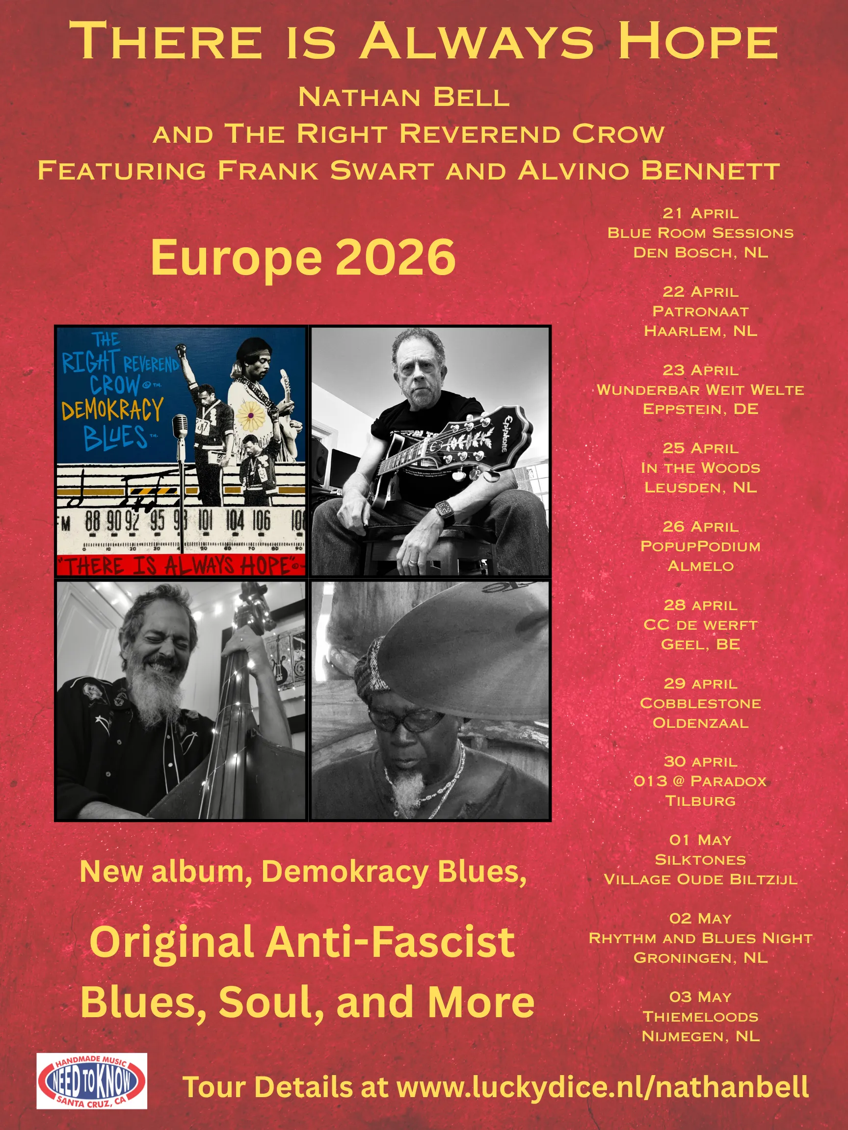Nathan Bell ist bekannt als herausragender Singer-Songwriter aus Signal Mountain, Tennessee, der mit seinen Songs, die zwischen Americana und Blues angesiedelt sind, innerhalb weniger Minuten zu begeistern weiß. Auf seinem neuen Album Demokrazy Blues, das Anfang 2026 unter dem Namen seines Alter Egos „The Right Reverend Crow” erscheinen wird, schlägt er rauere Töne an. Mit Einflüssen von Fat Possum und anderem Mississippi Blues. The Right Reverend Crow trat erstmals während der Aufnahmen zu seinem Album Red, White and American Blues in Erscheinung.